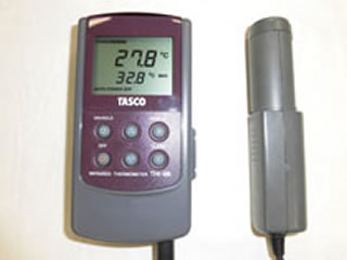カタログより。詳しくはお問合せ下さい。 測定温度範囲:-50から500℃ 精度:±(-10%rdg+2)℃ (測定温度範囲 -50℃から0℃にて) ±2℃ (測定温度範囲 0℃から200℃にて) ±1%rdg℃ (測定温度範囲 200℃から500℃にて) 但し ε=1.0 プローブケース温度 23±5℃ 周囲湿度 55%RH 再現性:±0.5℃ 応答速度:1.5sec (95%応答) 但しτ=0.0に設定時 電源:単3×4 寸法:本体部 140(L)×72(W)×34(H)mm プローブ部 140(L)×29(W)×34(H)mm タスコジャパン