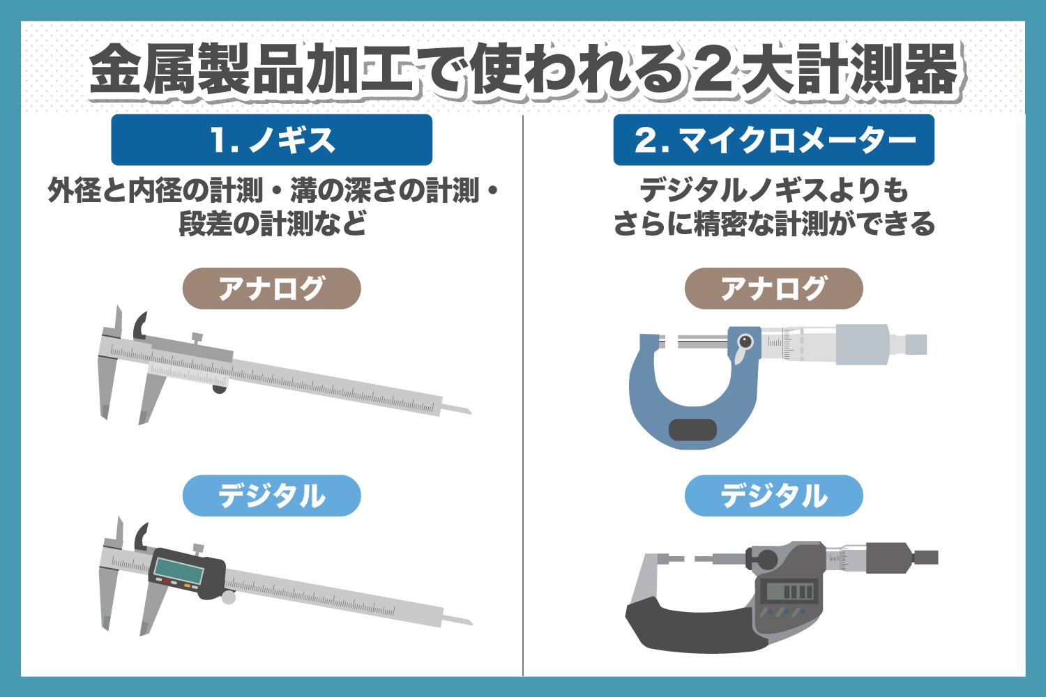 なかでもノギスとマイクロメーターは金属製品加工の計測において不可欠となる存在です。金属製品加工をする場合は汎用性・利便性が高いノギスと、汎用性にはやや欠けるものの精密な計測ができるマイクロメーター、この2つが最低限でも必要となります。