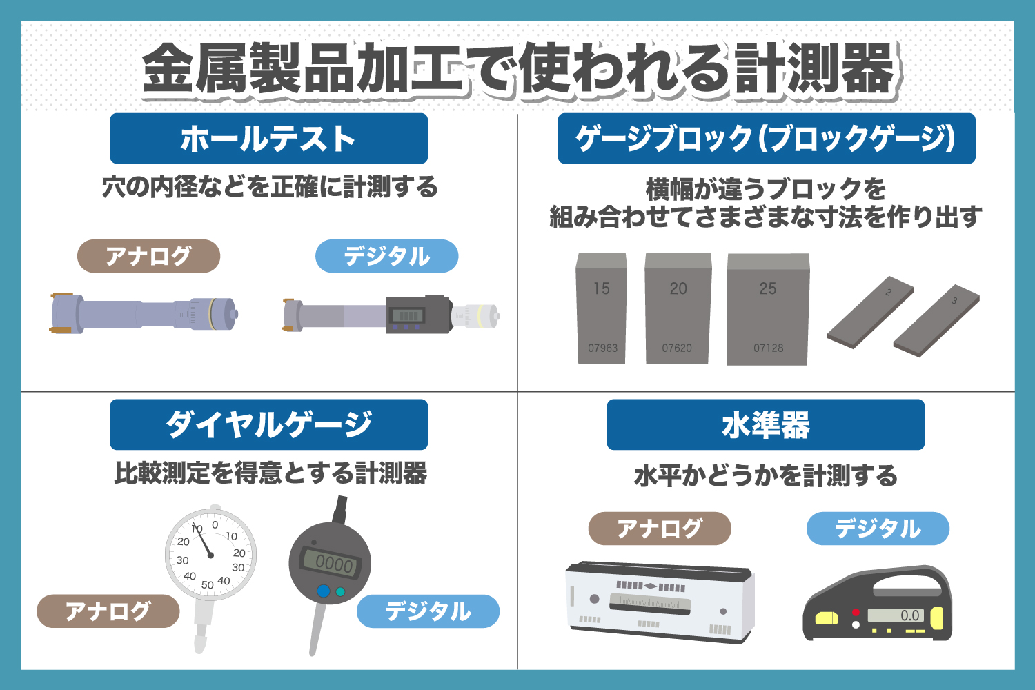 金属製品加工の際に使われる計測器としては、いわゆる定規的なスケール(直尺)はもちろんのこと、ノギスやマイクロメーター、さらにホールテスト・ゲージブロック(ブロックゲージ)・ダイヤルゲージ・水準器などもよく使われます。